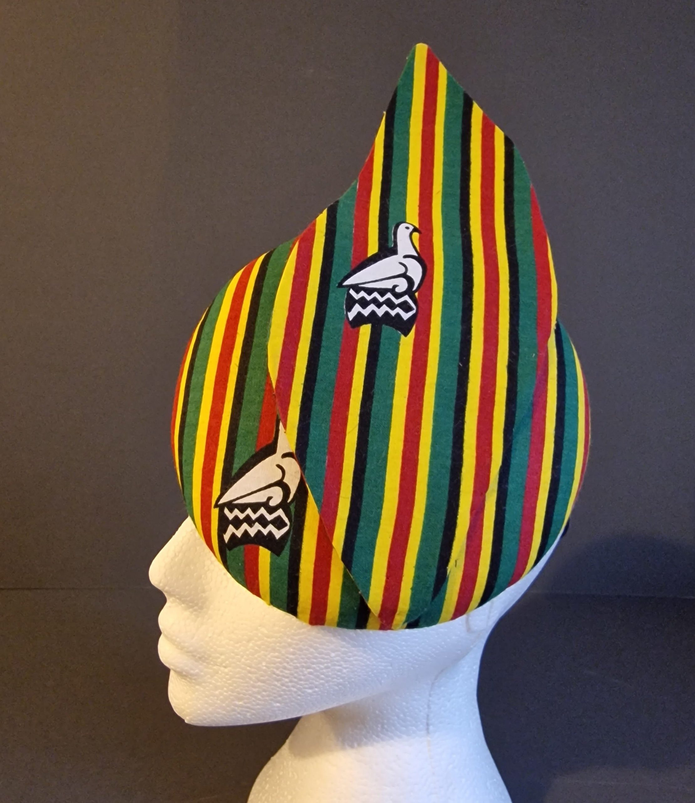 Button shaped fascinator with a base of sinamay fabric and Wax Cotton Ankara top fabric.