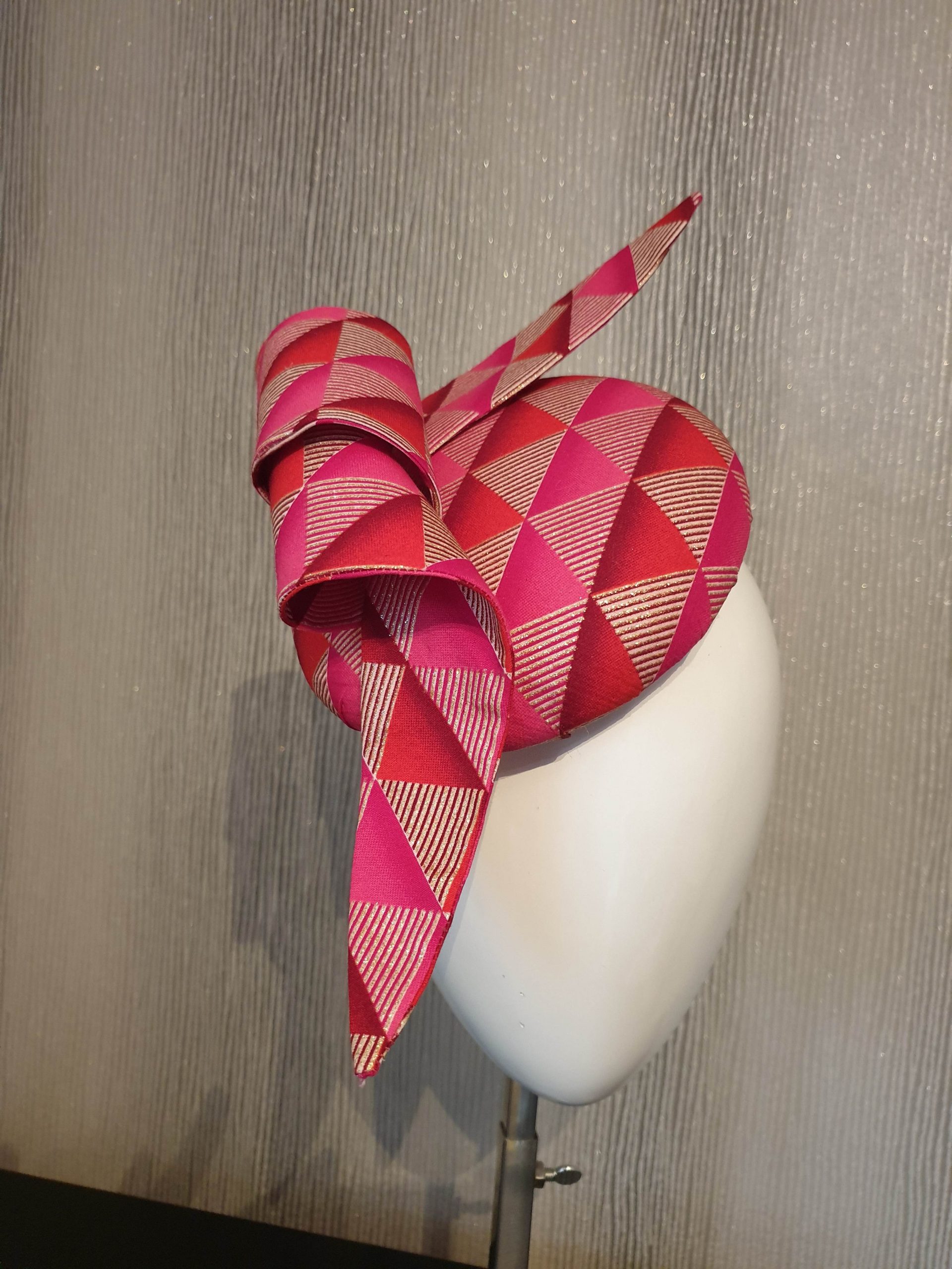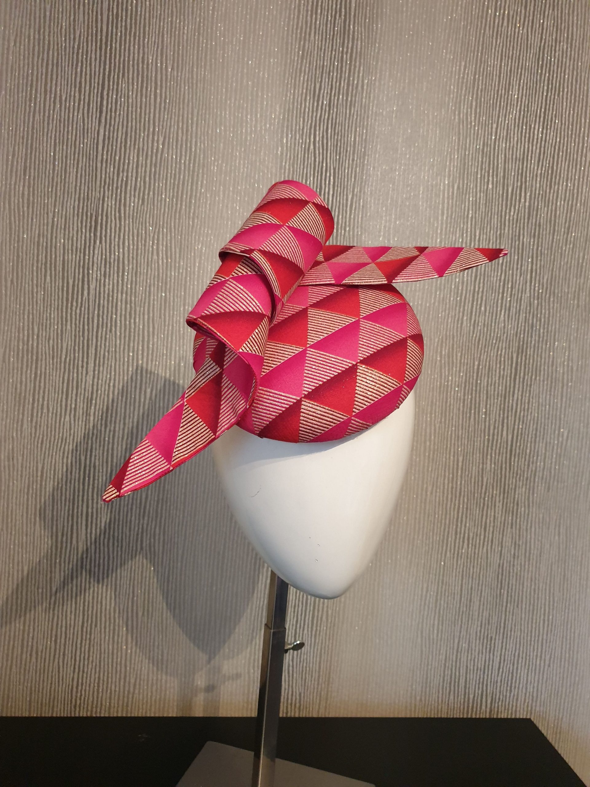 Button shaped fascinator with a base of sinamay fabric and Pink Wax Cotton Ankara Spiral